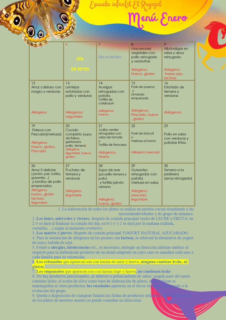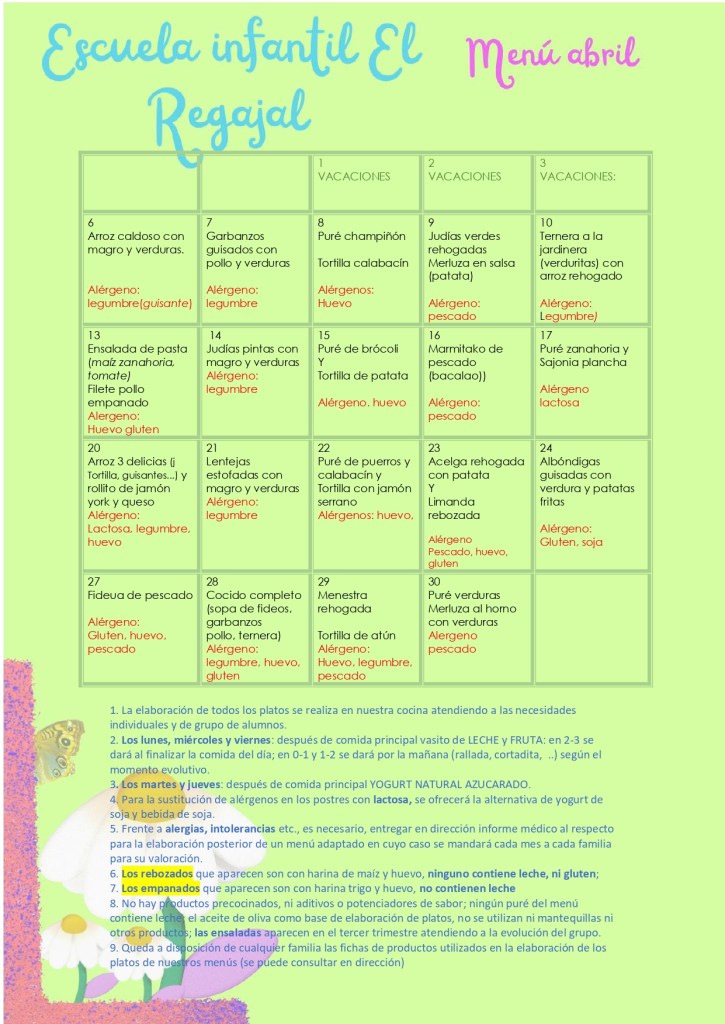 En nuestra escuela infantil disponemos de cocina propia. Tenemos unas instalaciones apropiadas desde donde se elabora el menú propuesto. Las cocineras de nuestra escuela tienen una larga experiencia en la preparación de dietas infantiles y una relación cercana con todos nuestros niños y participan en la vida escolar desde “muchas actividades”. La cocinera principal tiene la titulación de técnico superior y la pinche de cocina y los educadores (que atienden a los alumnos) tienen carnets de manipulador. Una empresa externa colabora con nosotros en la APPC (análisis y prevención de peligros en la elaboración de alimentos) y estamos sujetos a las revisiones del ministerio de sanidad que procedan.